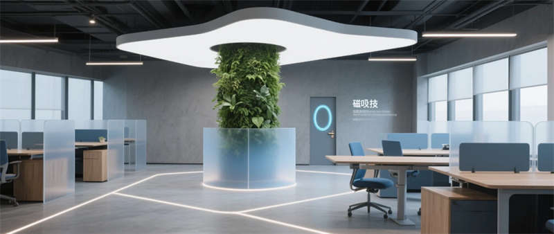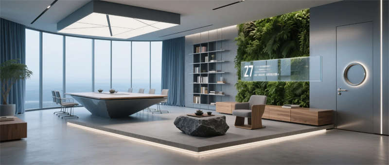 本項(xiàng)目以“未來(lái)生態(tài)辦公”為核心理念,打造1200㎡科技與自然交融的創(chuàng)新型辦公空間。設(shè)計(jì)采用啞光太空灰為主基調(diào),通過(guò)霧霾藍(lán)企業(yè)色與原木紋理的碰撞,在冷峻科技感中注入人文溫度。空間以微水泥地面為基底,貫穿透光亞克力與陽(yáng)極氧化鋁材質(zhì),配合隱藏式線性燈帶的流動(dòng)光影,構(gòu)建出具有呼吸感的數(shù)字美學(xué)場(chǎng)域。