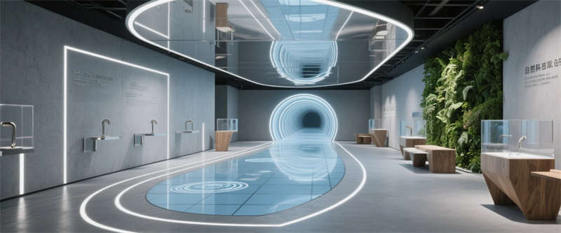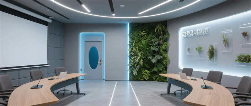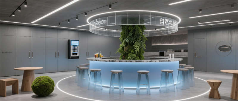 各區(qū)域通過(guò)四大統(tǒng)一性語(yǔ)言緊密串聯(lián):霧霾藍(lán)橢圓金屬門把手貫穿全空間,再生材料家具呼應(yīng)可持續(xù)發(fā)展理念,聲學(xué)墻面嵌入本地植物標(biāo)本強(qiáng)化生態(tài)屬性,智能燈光系統(tǒng)則通過(guò)4000K色溫線性燈帶實(shí)現(xiàn)晝夜場(chǎng)景的無(wú)縫切換。特別設(shè)計(jì)的全息投影展廳與智能階梯會(huì)議室,通過(guò)LED交互地屏與AR懸浮展臺(tái),將品牌科技基因融入空間體驗(yàn)。