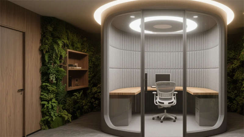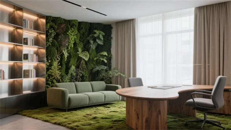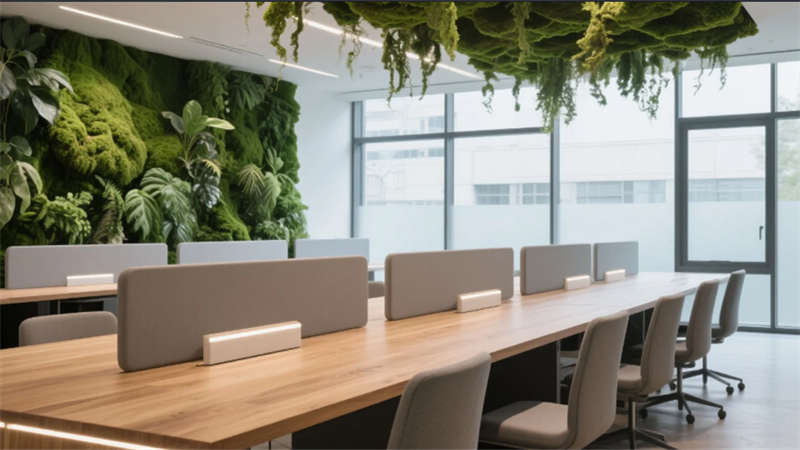 該設(shè)計(jì)以“自然共生”為脈絡(luò),將綠植生態(tài)系統(tǒng)與現(xiàn)代辦公需求深度融合。入口處以苔蘚藝術(shù)臺與流水光墻奠定基調(diào),流動(dòng)的綠意從呼吸幕墻延伸至開放辦公區(qū),原木桌面在漫射天光中模糊室內(nèi)外界限。獨(dú)立辦公室的垂直森林墻與靜音艙的苔蘚隔斷,在私密空間延續(xù)生態(tài)語言。