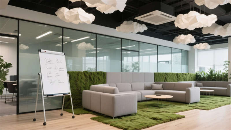協(xié)作區(qū)域呈現(xiàn)有機(jī)張力:茶水間的階梯式布局激發(fā)非正式交流,可書寫玻璃環(huán)繞的頭腦風(fēng)暴區(qū)釋放創(chuàng)造力,而模塊化沙發(fā)的灰綠色調(diào)呼應(yīng)窗外城市綠景。多功能廳的折疊原木階梯與生態(tài)屏幕,在科技與自然間取得平衡。