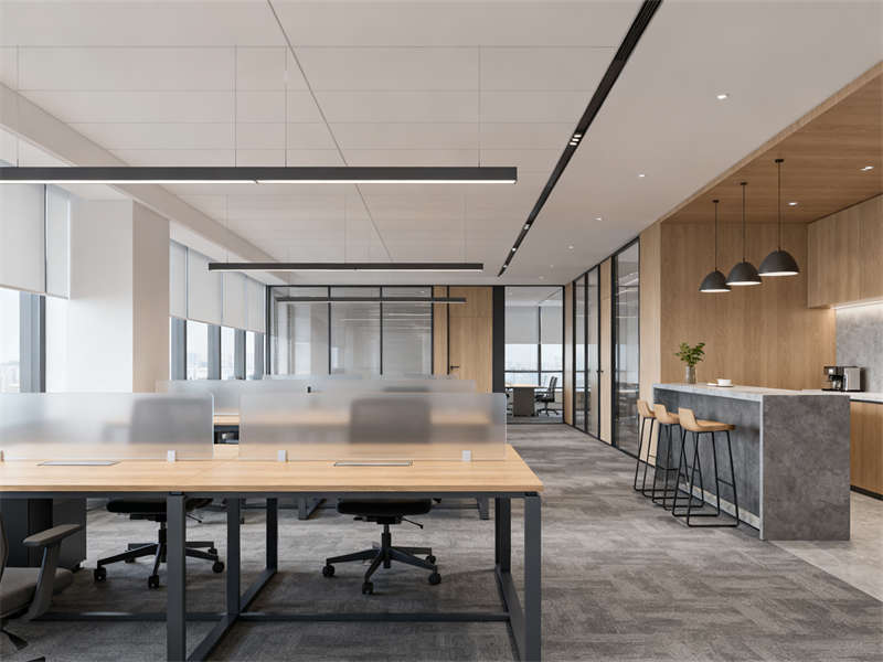 開放辦公區(qū)以通透協(xié)作為設(shè)計(jì)重點(diǎn),半透明磨砂玻璃隔板兼顧隱私與互動(dòng),木色桌面與深灰金屬支架結(jié)合,延續(xù)整體材質(zhì)基調(diào),搭配簡約照明,營造專注且不壓抑的工作氛圍。獨(dú)立辦公室劃分出辦公與接待區(qū)域,木飾面背景墻搭配淺灰布藝沙發(fā),在保持商務(wù)感的同時(shí),增添柔和質(zhì)感,滿足私密溝通需求。