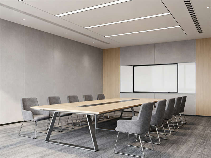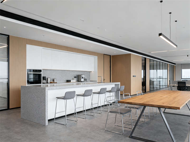中型會(huì)議室圍繞協(xié)作功能展開,長條式會(huì)議桌與玻璃隔斷搭配,既保證空間開闊,又能與外部辦公區(qū)形成視覺聯(lián)動(dòng),灰色布藝座椅與頂部圓形吊燈呼應(yīng),讓會(huì)議場景兼具功能性與舒適感。茶水間則通過淺灰石英石臺面、木色護(hù)墻板與暖光燈帶,營造輕松休閑的氛圍,成為辦公間隙的放松節(jié)點(diǎn)。