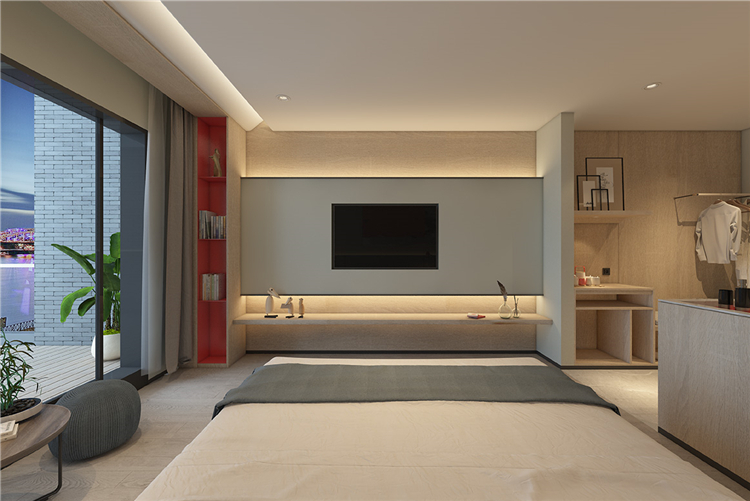 這些匠心的設計,令空間在保留原有通透性的情況下規整而不凌亂,給人以直觀的親近感受臥房的燈光在功能上具有有針對性,點光源很少,多采用柔和的氛圍光,而貼心明亮的臺燈設計,亦可滿足人們的閱讀需求。