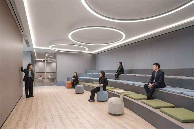 以高效私密和開(kāi)放交流為光譜的兩軸,設(shè)計(jì)團(tuán)隊(duì)設(shè)計(jì)了完全私密的電話亭,部分私密的玻璃盒子辦公區(qū),半開(kāi)放的格柵盒子辦公區(qū),以及完全打開(kāi)鼓勵(lì)交流的開(kāi)放式辦公區(qū)。不同尺度,不同開(kāi)放度的辦公區(qū),為所有員工提供了包容、公平、有彈性、可持續(xù)和健康的工作空間,社恐與社牛,各得其所。