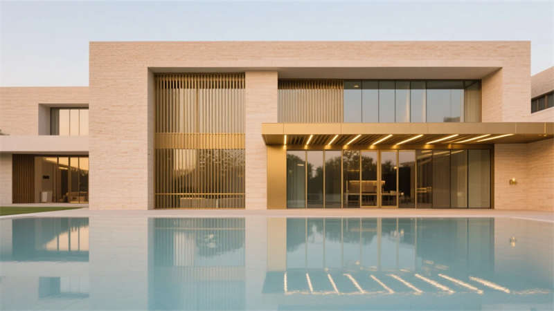 建筑外觀通過香檳金格柵與玻璃的虛實(shí)對(duì)話,成為城市界面的優(yōu)雅符號(hào)。室內(nèi)外空間流暢銜接,光影在金屬、石材與水體間自然游走,最終凝聚成兼具現(xiàn)代鋒芒與人文溫度的都市謐境,為賓客提供超越尋常的精神棲居。