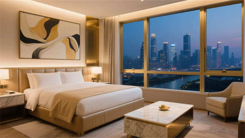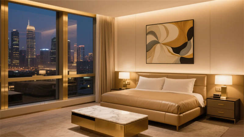 酒店以當(dāng)代輕奢美學(xué)為靈魂,將精致質(zhì)感融入每個(gè)空間肌理。淺金色金屬與溫潤(rùn)大理石的碰撞,勾勒出低調(diào)奢華的氣質(zhì)基底,暖灰中性色調(diào)營(yíng)造舒緩靜謐的氛圍場(chǎng)域。落地玻璃幕墻引自然入室,琥珀色玻璃屏風(fēng)與鎏金藝術(shù)裝置在光影交織中煥發(fā)靈動(dòng)生機(jī)。