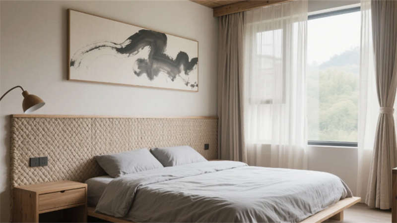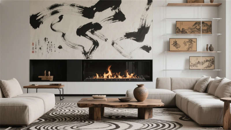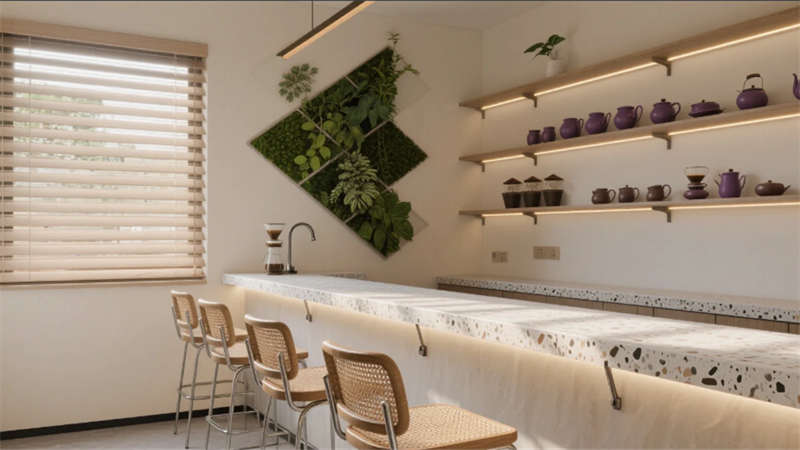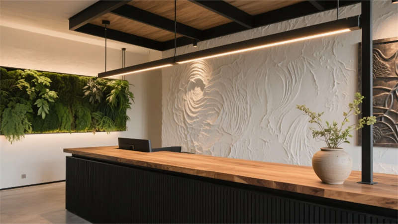 步入大廳,弧形亞麻沙發(fā)與編織地毯圍合出松弛場(chǎng)域,整面落地窗借景庭院竹影,琴葉榕與懸浮綠植墻形成立體生態(tài)敘事。多功能區(qū)以巢湖水波紋地毯呼應(yīng)地域脈絡(luò),壁爐旁的非遺火筆畫(huà)裝置暗藏城市文化密碼。咖啡吧藤編座椅與水磨石臺(tái)面碰撞,幾何綠植墻在百葉光影中演繹晨昏詩(shī)意。
