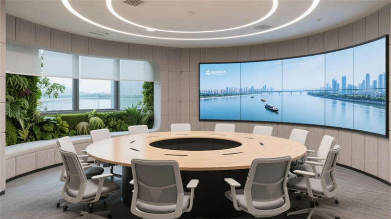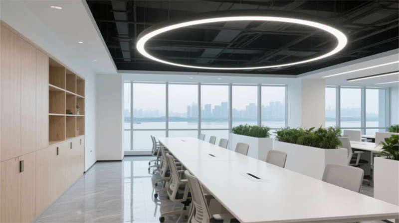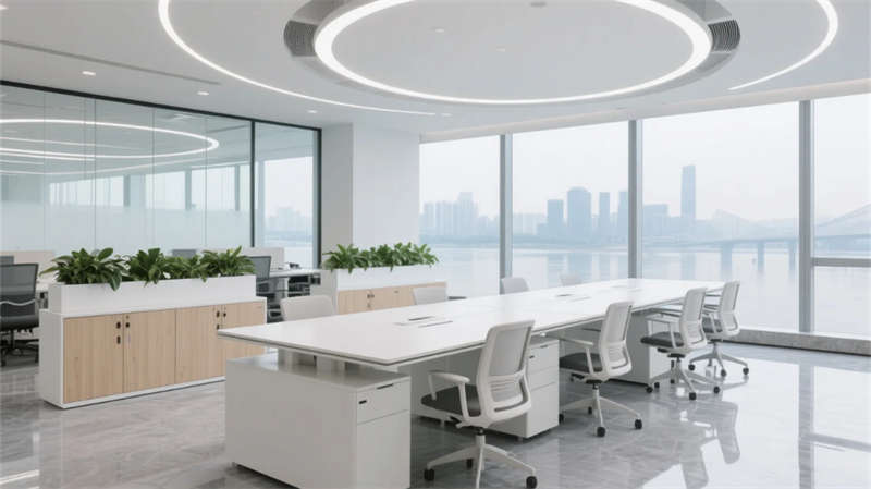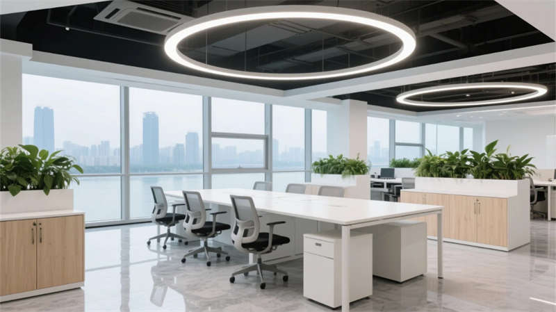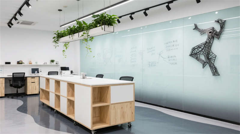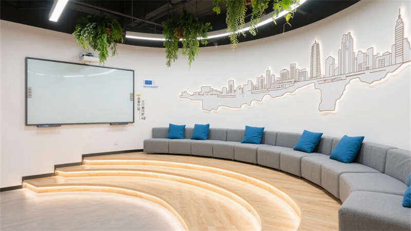 開(kāi)放辦公區(qū)以模塊化綠植隔斷柔化邊界,智能會(huì)議艙曲面屏動(dòng)態(tài)呈現(xiàn)江岸線,賦予協(xié)作以在地詩(shī)意。創(chuàng)意實(shí)驗(yàn)室的可書(shū)寫(xiě)玻璃墻與磁吸家具激發(fā)即興創(chuàng)造,而階梯沙龍區(qū)弧形燈帶如江水蜿蜒,引導(dǎo)思想交匯。